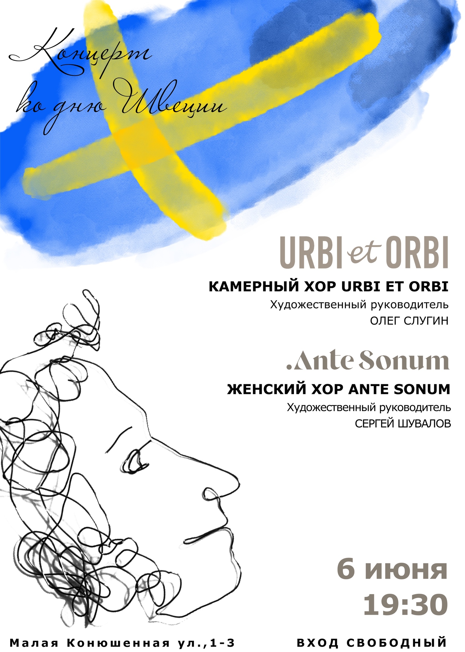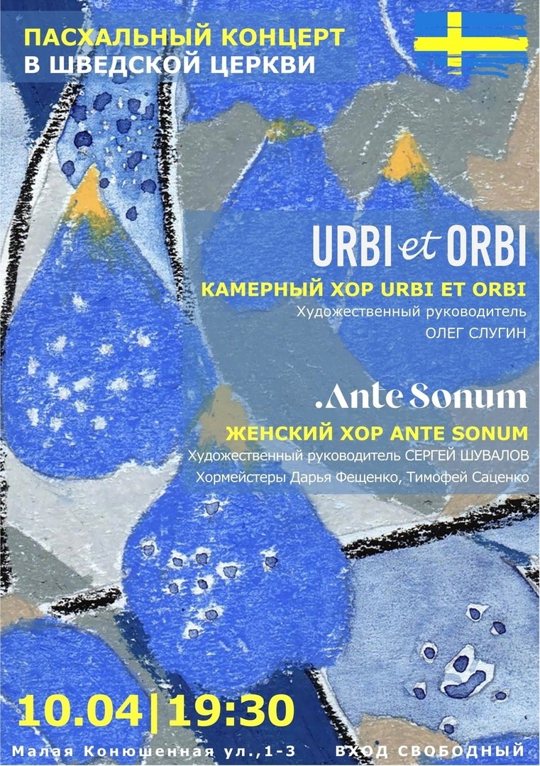 Текст 6 июня (Вт) в 19:30 приглашаем всех в [club70230638|Шведскую церковь св. Екатерины] на концерт ко Дню Швеции и дню рождения Пушкина. В программе музыка шведских и русских композиторов от хора [club76708135|Urbi et Orbi] и женского хора [club200344915|Ante Sonum]. Концерт организован консульством Швеции в Петербурге. Напоминаем, что шведское консульство прекращает свою работу с 1 сентября. Окно в Европу закрывается, приходите попрощаться 👋 #Ингерманландия #Ингрия #музыка #анонс