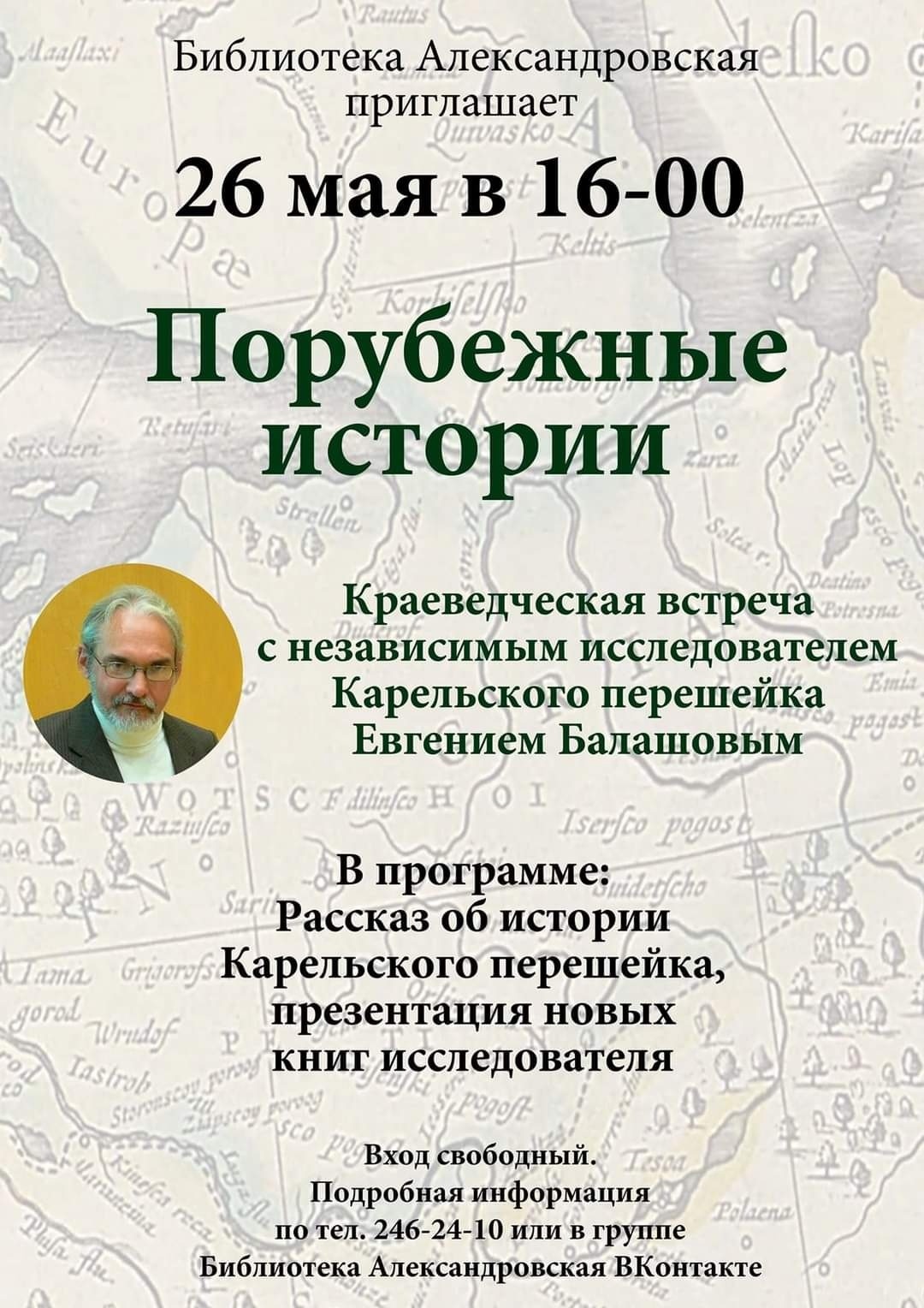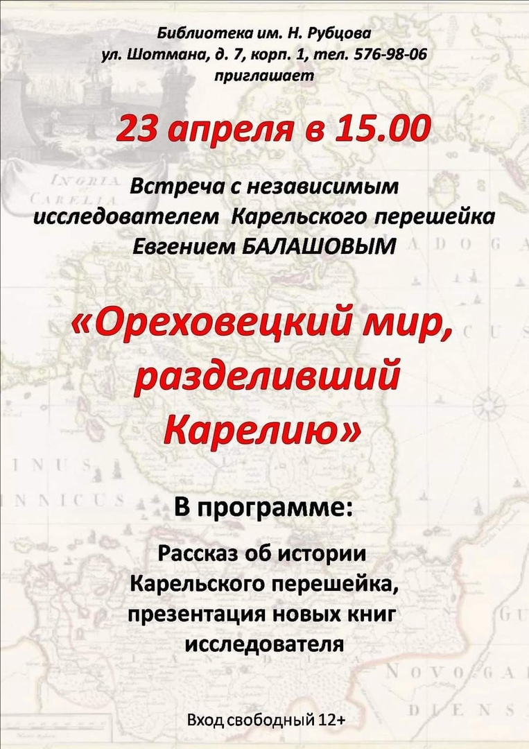 Текст Камрады, приглашаем на встречу с краеведом [id9302466|Евгением Балашовым] в библиотеку [club76629|Александровская]! Открытая лекция состоится уже завтра, в пятницу, 26 мая. Приходите узнать про Karjalan Kannas 🌲 #Ингерманландия #Ингрия #краеведение