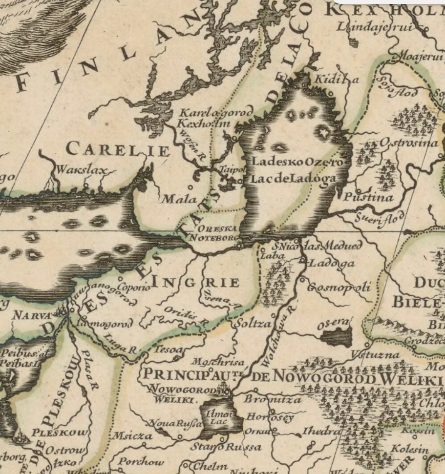 Текст Фрагмент той самой французской карты XVII века, которую на этой неделе так подробно обсуждали двое пожилых мужчин. Украина на ней вообще-то есть. А главное — на ней хорошо видна Ингрия с её реками, крепостями и прочей топонимикой. Правда, как часть Шведского королевства 👑 #Ингерманландия #географические_карты