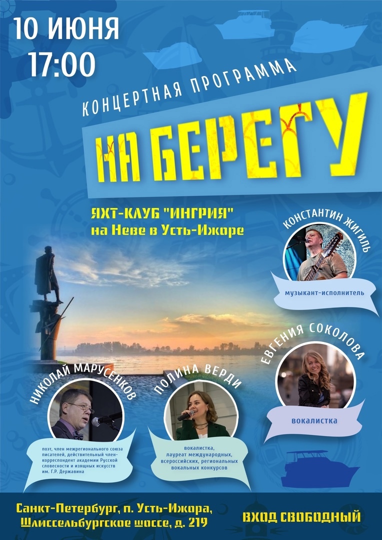 Текст Ингрия — это не только историческое название нашего региона, но и [club40787544|яхт-клуб] с более чем 10-летней историей. Приобщиться к водной стихии в самом центре Ингрии можно в эту субботу, 10 июня, в 17:00! Добро пожаловать в Усть-Ижору, на Шлиссельбургское шоссе, 219, где для вас выступят [id7169478|Полина Верди], [id5961990|Константин Жигиль], Николай Марусенков и Евгения Соколова. Вход свободный! 🎶 #Ингерманландия #Ингрия #УстьИжора #яхтинг #weekend #концерт #музыка