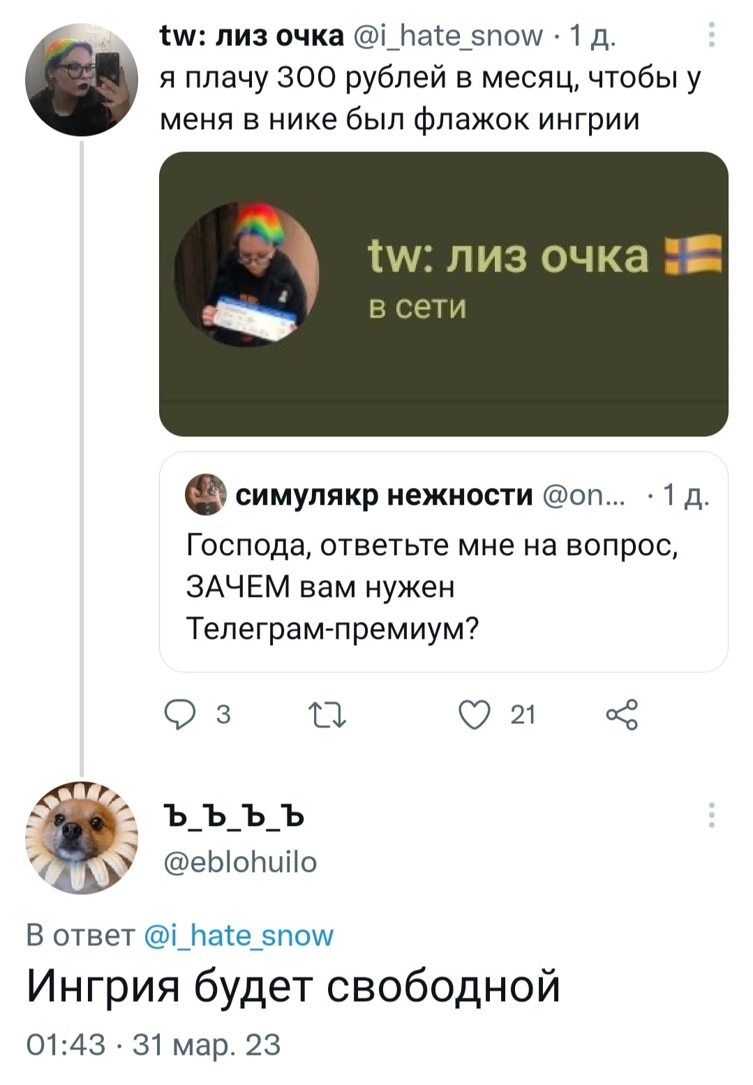 Текст Ингерманландцы выходят сейчас на антивоенные митинги [https://vk.com/wall-25207919_99185|не только в Петербурге], но и по всему миру. На фото: регионалисты [https://vk.com/mmvoytenkov|Ингрии] и [https://vk.com/victorkorb|Сибири] с национальными флагами перед посольством РФ в Литве. Вильнюс, март 2022 года 🇱🇹 #Ингерманландия #НетВойне