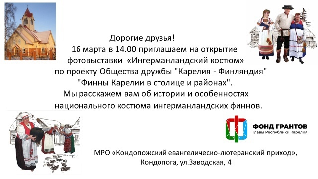 Текст 16 марта (Ср) в 14:00 в карельской Кондопоге открывается фотовыставка, посвящённая истории ингерманландского народного костюма. Если вам интересно узнать, как выглядели наши пращуры, — добро пожаловать в братскую Карелию! В работах [id286478745|Евфросинии Капустиной] вы увидите все тонкости нарядов древних ингерманландцев, научитесь различать одежду эвремейсов и савакотов, узнаете зашифрованные в затейливых узорах обрядовые обереги инкери. Милости просим в [club18959947|кирху Вознесения Христова]: г. Кондопога, ул. Заводская, д. 4 💒 #Ингерманландия #Карелия #выставка #фотографии #культура #анонс