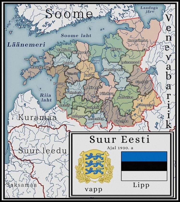 Текст 🇪🇪 "Великая Эстония" — проект 1930 года. На карте под властью Таллинна оказались Псковщина и основная часть Ингрии (Ingerimaa) примерно до Лавы и Сестры, а также север современной Латвии и западные рубежи Новгородчины. #Ингерманландия #географические_карты