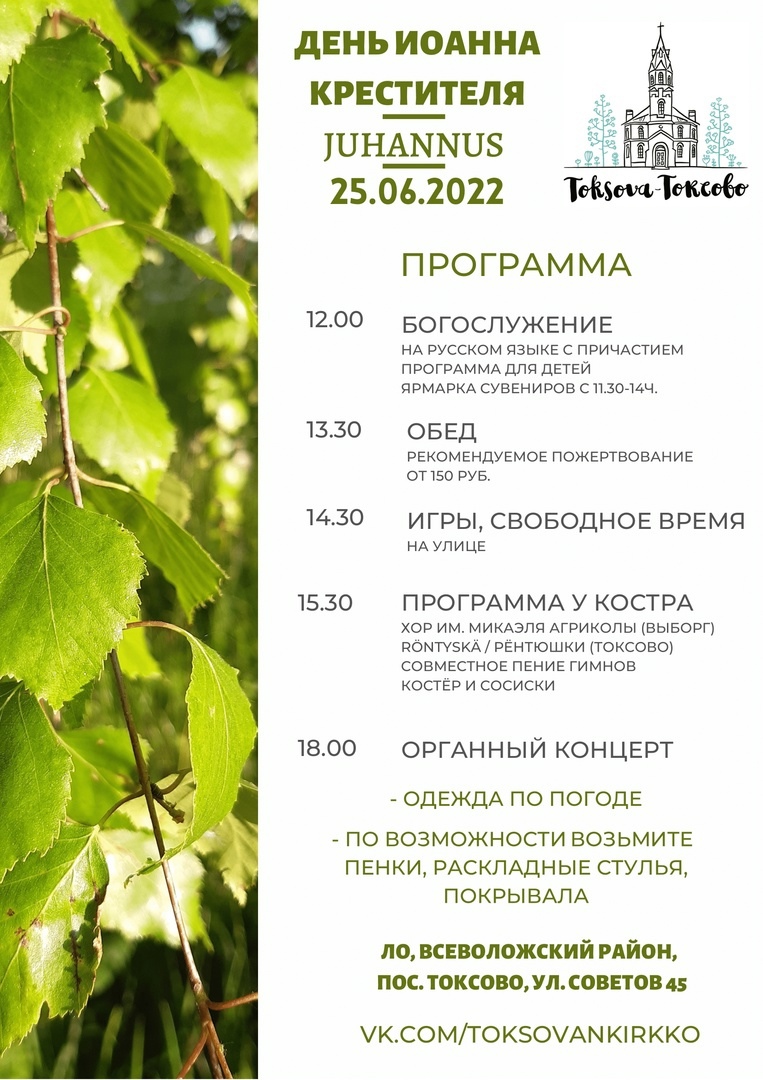 Текст 🔥 Юханнус-2022 — добро пожаловать в [club36775134|Токсово]! 25 июня (Сб) можно будет принять участие в полной программе или посетить часть программы по душе. Кому рёнтюшки у костра, а кому Бах в кирхе. Полное расписание прилагается. Всем счастья и удачи в самый длинный день в году! 🔥 #Ингерманландия #Juhannus #Токсово